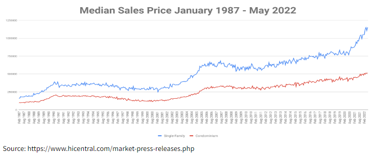 The chart above shows Oahu’s median sales price since 1987. Real estate typically moves in cycles of seven to twelve years, with periods of growth, stabilization, and correction before rising again. During the 2008 financial crisis, while mainland property values dropped by forty to sixty percent, Hawaii experienced only a modest five to ten percent decline, showing the market’s remarkable resilience and enduring appeal.