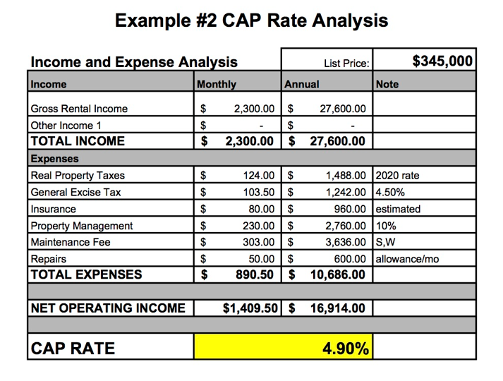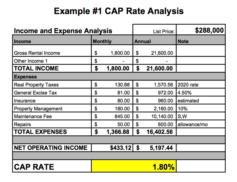 Do you own rental properties? Do you know how well those properties are performing? How do you measure your rental performance? A CAP rate, short for capitalization rate is a quick way to tell the economic viability of a rental property. CAP rate calculates the net operating income(income minus expenses) divided by the value of your property. In example 1 we see a rental property with a 1.8% capitalization rate which may not be the most profitable asset. In example 2 we see a rental property with a 4.9% capitalization rate, a high-performing asset in the Hawaii market. We can run a free in-depth property analysis of your assets.